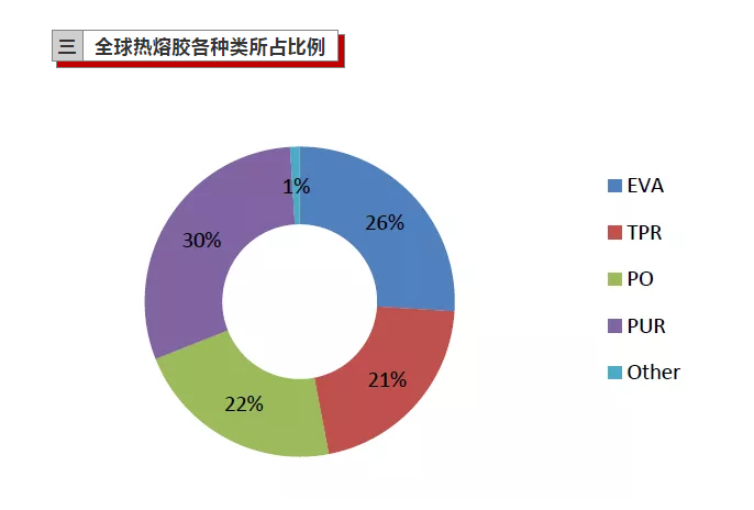 通过图片了解世界以及中国eva热熔胶,TPR热熔胶,PO热熔胶,PUR热熔胶现今的分布,应用行业占比情况。