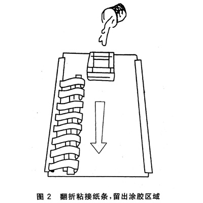 板上(如木板等),再把垫板置于操作平台上。将粘接纸条以间距6 mm整齐排列,首条离顶端约75 mm处,用压敏胶枯带将这些粘接纸条粘贴到涂胶底纸上,然后如图2翻折,露出涂胶底纸上准备涂胶地方。